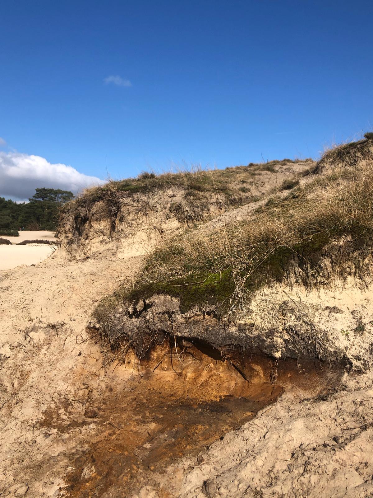 Cool! Onder de oplossende mist ontrolt het stuifzand van de Soesterduinen. In een richeltje spot ik een paleosol: een begraven bodemprofiel. Eeuwenlang hebben water, zuren en biologische activiteit gezorgd voor de vorming van prachtige bruin-zwarte kleuren, maar daar bovenop is laagje op laagje lichtgeel stuifzand terechtgekomen.